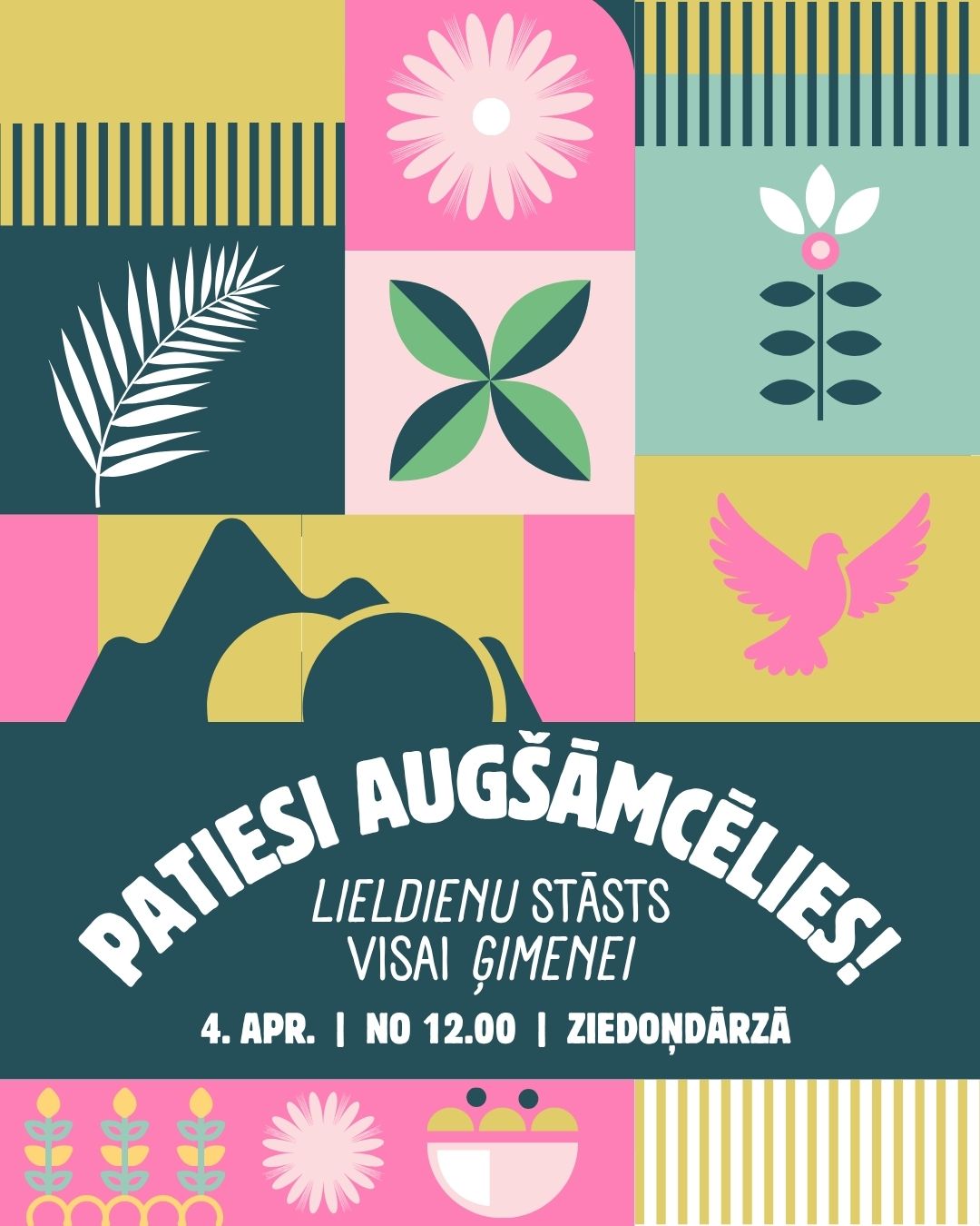 Sestdien, 4. aprīlī, Ziedoņdārzā notiks aktivitātes ģimenēm ar bērniem, kur būs dažādas stacijas un darbnīcas bērniem. Aicināti piedalīties ir bērni vecumā no 5 līdz 12 gadiem un viņu vecāki. Mazākiem bērniem aktivitātes varētu būt mazliet par sarežģītu. Norises laiks no 12.00 līdz 15.00. Pievienjies jebkurā laikā. Nav nepieciešama reģistrācija.